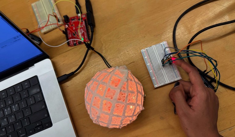 At the December 2024 SVA ixD exhibition, we split the gallery into two mirror zones, "Brooklyn" and "Bangalore", to dramatize the lamp's promise of collapsing distance. Visitors wore the glove in one zone and watched the lamp respond in the other.
