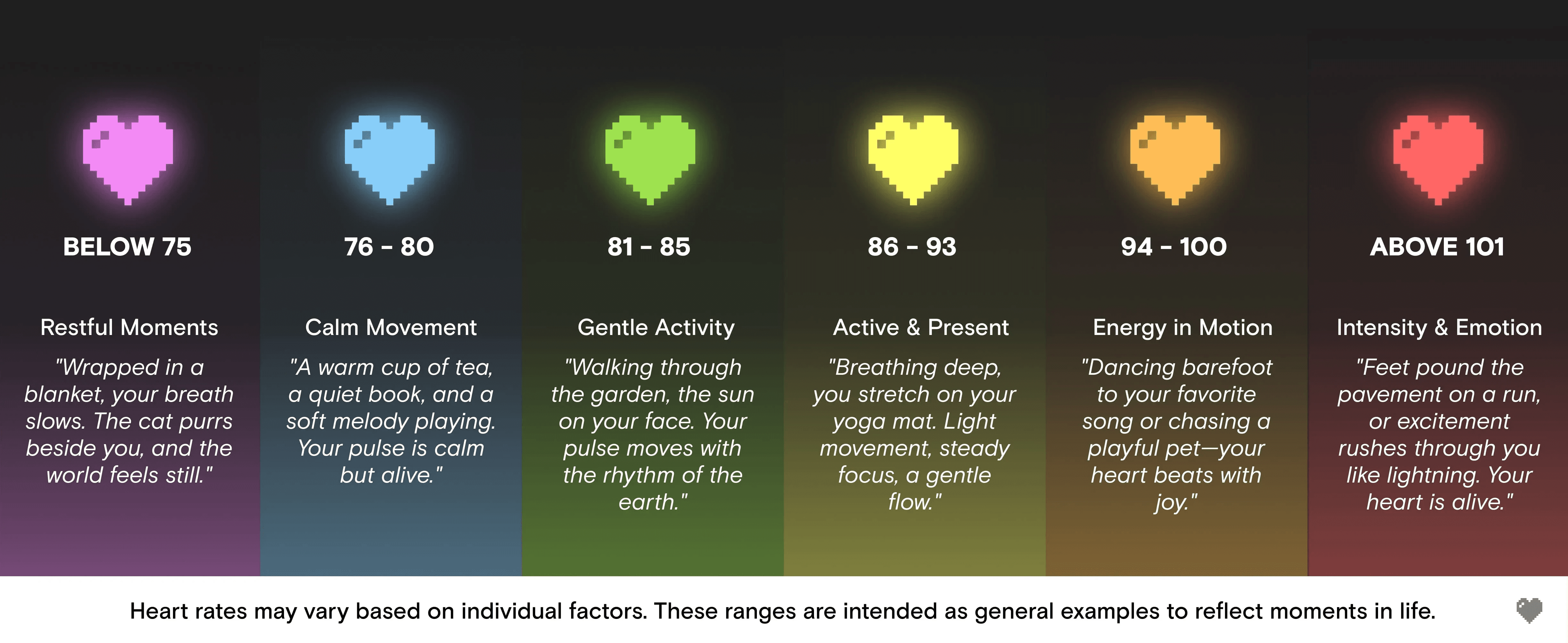 The signal communicates "I'm here", never "I'm watching you." No data logging, no heart-rate history, no alerts.