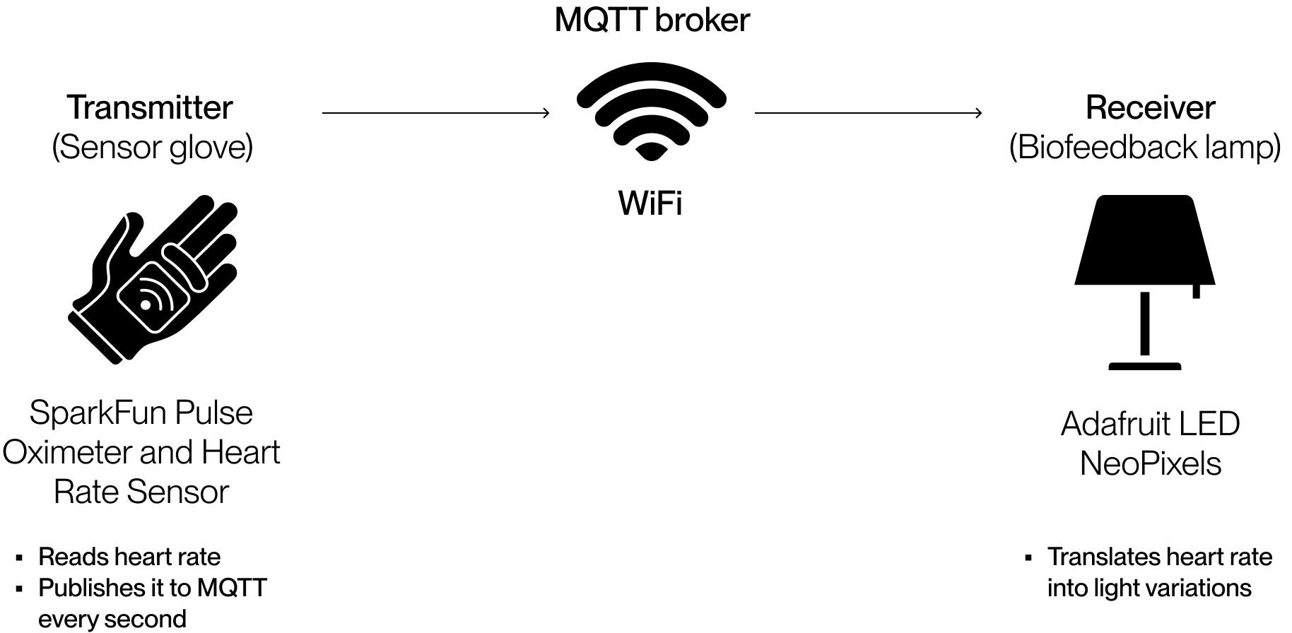 A wearable sensor glove that reads your heartbeat and a bedside lamp that echoes it as a breathing glow over Wi-Fi without screens, notifications, manual input.